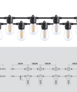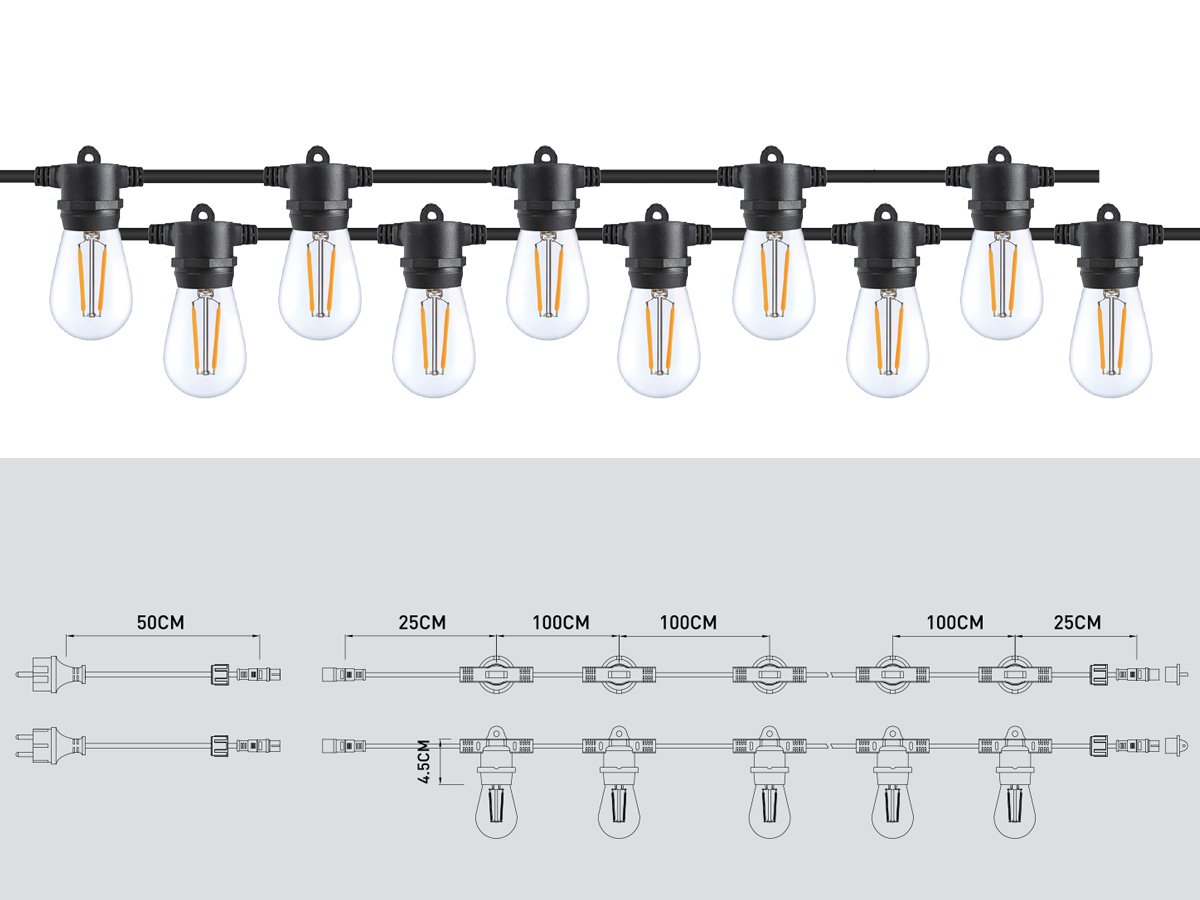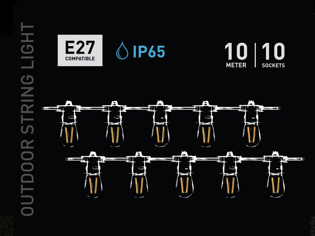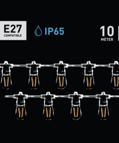 10 meters black string light with 10 pieces E27 fittings that can be connected – 2C x 1.0 mm – IP65 waterproof – with cord and plug – extendable with socket and light cords can be connected to each other – Party lighting for indoors and outdoors – lamps not included