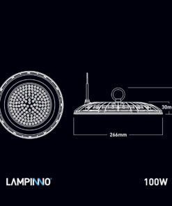 100 watt SMD LED UFO Highbay Slim Waterproof 6500K – luminous flux 10000 lumen – light color daylight 6500K – waterproof IP65 – with lens – beam angle 90° – product color black – Ø 266 x 30mm – material aluminum and PC Lens – mounting set not included – lifespan 25,000 hours – voltage 220-240V – PF >0.9 – CRI >80