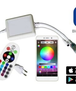 20 meters 8W/m SMD Neon LED Strip waterproof RGB Bluetooth – dimming and color replacement with remote control and mobile Bluetooth app – 120 LED/meter – light color RGB – IP65 waterproof – length 20m – can be shortened per 1 meter or more – lifespan 30,000 hours – voltage 220-240 V – SMD 5050 – 1 Neon LED Strip plug with Bluetooth and remote controller included