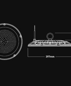 200 watt SMD LED UFO Highbay Waterproof 6500K – luminous flux 21000 lumen – light color Daylight 6500K – waterproof IP65 – with glass – beam angle 90° – product color black – Ø 397 x 29mm – material aluminum and glass – mounting set not included – lifespan 30,000 hours – voltage 220-240V – PF >0.9 – CRI >80