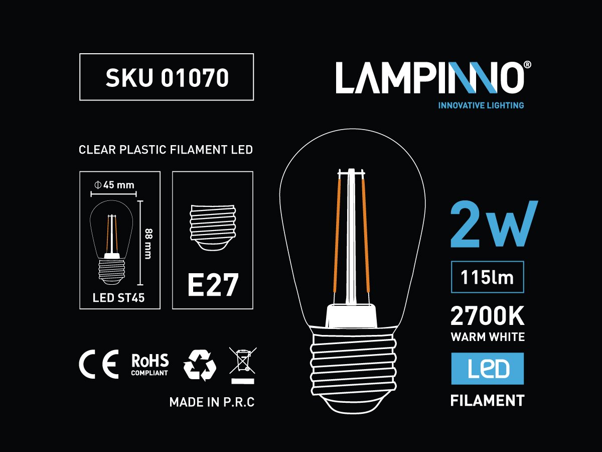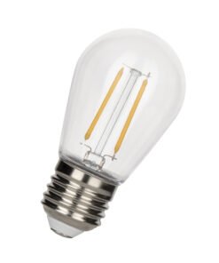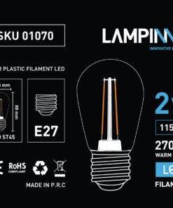 2 watt E27 ST45 Filament LED Bulb 2700K – lichtstroom 140 lumen – lichtkleur warm wit 2700K – stralingshoek 360° – afm Ø 45 x 88mm – materiaal plastic shockproof – levensduur 25.000 uren – voltage 220-240V – Prikkabel niet inclusief