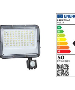 50W 5000K LED Floodlight with Sensor and Lens, Waterproof – luminous flux 4,800 lumens – light color daylight 5000K – waterproof IP65 – beam angle 90° – product color sand black – dimensions 202 x 200 x 31 mm – material aluminum and PC lens – rotatable motion sensor with 2 to 8 m detection range – with lens for precise light beams without waste for maximum brightness – protection against mechanical impacts IK07 – mounting kit not included – lifespan 30,000 hours – voltage 200-240V