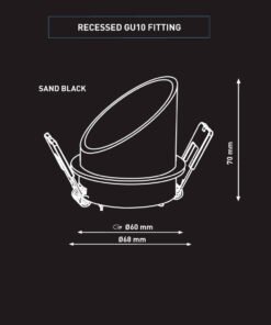 GU10 Recessed design fixture cylinder sand black with lamp holder – seal IP20 – product color sand black – dimensions. Ø 68 x 70mm – installation diameter ø 60mm – fitting GU10 – including ceramic lamp holder – light source bulb not included – material aluminum – suitable for indoors – one bulb input – voltage 220-240V