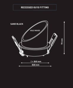 GU10 Recessed design fixture cylinder sand gold and black with lamp holder – seal IP20 – product color sand gold black – dimensions. Ø 68 x 70mm – installation diameter ø 60mm – material aluminum – fitting GU10 – including ceramic lamp holder – light source bulb not included – suitable for indoors – one bulb input – voltage 220-240V