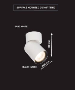 GU10 Opbouwspot fixture cilinder zand zand wit en zwart draaibaar – afdichting IP20 – product kleur zand zand wit en zwart ring – afm. Ø 60 x 100mm – draaibaar 350° en kantelbaar 50° – materiaal aluminum – bevestiging inclusief – fitting GU10 – bulb niet inbegrepen – geschikt voor binnen – een bulb invoer – voltage 220-240V – max 40 watt