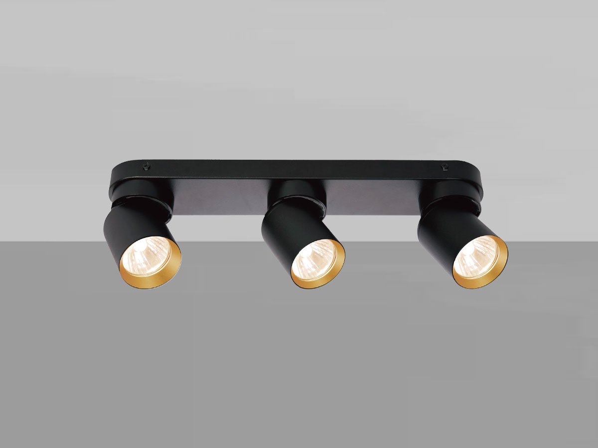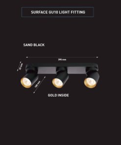 GU10 Surface-mounted spotlight fixture triple cylinder sand black and gold rotatable – seal IP20 – product color sand black and gold ring – dimensions. Ø 60 x 100mm – dimensions wall holder 390 x 60 x 25mm – rotatable 350° and tiltable 50° – material aluminum and iron – mounting included – fitting GU10 – bulb not included – suitable for indoors – 3 x bulb input – voltage 220-240V – max 40 watts