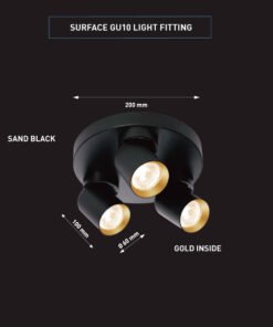 Round GU10 Surface-mounted spotlight fixture triple cylinder sand black and gold rotatable – seal IP20 – product color sand black and gold ring – dimensions. Ø 60 x 100mm – size wall holder Ø 390 x 25mm – rotatable 350° and tiltable 50° – material aluminum and iron – mounting included – fitting GU10 – bulb not included – suitable for indoors – 3 x bulb input – voltage 220-240V – max 40 watts