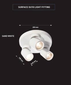 Round GU10 Surface-mounted spotlight fixture triple cylinder sand white rotatable – seal IP20 – product color sand white – dimensions. Ø 60 x 100mm – size wall holder Ø 390 x 25mm – rotatable 350° and tiltable 50° – material aluminum and iron – mounting included – fitting GU10 – bulb not included – suitable for indoors – 3 x bulb input – voltage 220-240V – max 40 watts