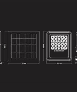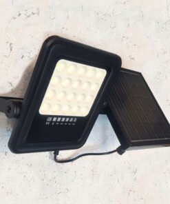 Solar LED Floodlight with Remote Control – daylight color temperature 5000K – waterproof IP65 – maximum luminous flux 500 lumens – product color black – dimensions 200 x 170 mm – beam angle 90° – housing made of aluminum and ABS – solar panel dimensions 210 x 200 mm – solar panel voltage 6V – battery capacity 5Ah – remote control allows dimming and timer setting – in auto mode, the light operates at 100% brightness for the first hour, then 80% for the second hour, followed by 60%, 50%, and 30%, for a total of 6 hours – protection against mechanical impacts IK07 – mounting hardware included