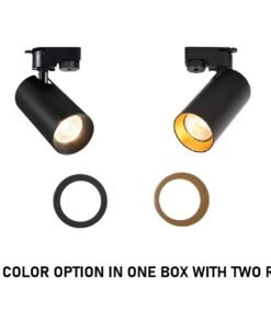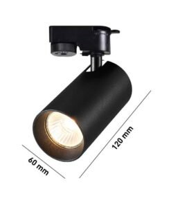 Railspot GU10 Fixture cylinder rotatable sand black or gold with two rings in box – suitable for 1 phase 2 wire track – sealing IP20 – product color sand black or sand black and gold with two rings options – dim. Ø 60 x 120mm – rotatable 350° and tiltable 90° – material aluminum and PC – mounting included – fitting GU10 – bulb and track not included – suitable for indoor use – one bulb input – voltage 220-240V – max 35 watt