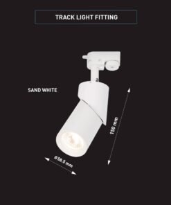 track light spot GU10 fixture cylinder sand white rotatable – suitable for 1 phase 2 wire track light – seal IP20 – product color sand white – dimensions. Ø 58.5 x 150mm – rotatable 350° and tiltable 180° – material aluminum and PC – mounting included – fitting GU10 – bulb and track not included – suitable for indoors – one bulb input – voltage 220-240V – max 35 watts